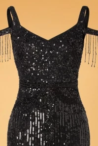 This 20s Chloe Sequin Maxi Dress in Black is a gorgeous hand embellished reproduction of the elegant 1920s maxi dresses! This dress evokes the romance and glamour of days gone! This beauty, a sparkling headband in your hair and man candy on your arm… picture perfect! This showstopper is hand embellished with tiny, sparkling glass beads and sequins! The top flaunts two shoulder straps on each side, one of which is worn off-shoulder and beaded fringes. Made of a black, semi-sheer fabric with a light stretch and lined for extra comfort. Now let’s hope your man/date is as gallant as the men used to be in the olden days 😉