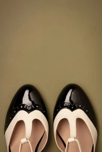 “Step out in style… Gatsby style!” You will look and feel like your most stylish self in these 20s Gatsby T-Strap Pumps in Black and White! Made of black faux patent leather and ivory-white faux leather, finished with a T-strap, brogue detailing and a high heel. The soft insole made of leather