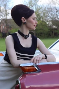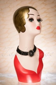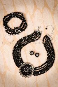 Add that Audrey sparkle to your look with this 50s Audrey Jet Flower Necklace in Black and Silver! This short necklace is comprised of 5 strands of small, black glass pearls finished with an eye-catching large silver-toned flower. The faceted stones and rhinestones complete the glamorous look. We are certain that Audrey Hepburn would have loved adding this beauty to her collection!