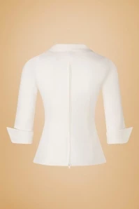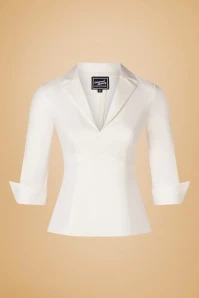 “Dress how you want to be addressed! ‘Boss Lady’ will do just fine!’ 😉 You are the one in charge when wearing this 50s Dianne Blouse in Crispy White! This season our talented in-house designers were inspired by the ambition and perseverance of our very own Boss Lady Angelique who makes all of her dreams come true… that’s what we call women empowerment! This slightly tailored, classy blouse flaunts a comfy fit, a pointy lapel collar and 3/4 sleeves with pointy turn-ups. Made of a sturdy, yet supple, ivory-white fabric with just a hint of stretch that is a dream to wear. Match Dianne with high waist trousers or a pencil skirt and high heels for that effortless glam look that Lauren Bacall was famous for. And let’s not forget one of her quotes: ”I am not a has-been. I am a will be!” And that’s the way it is, Hunnie 😉