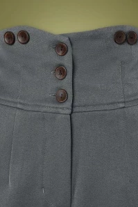 The 50s Girl Boss Trousers in Grey are inspired by the trousers that progressive women wore in the 1940s & 1950s! The feminine high waist contrasts beautifully with the wide leg and is very flattering, especially with fuller hips/buttocks. Thanks to the button detailing this beauty can be worn with braces adding a playful touch. Made of a supple, grey fabric with just a hint of stretch and finished with classy cuffed legs. Pair with a white blouse and pumps for a perfect business look in retro style!
