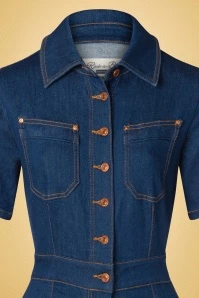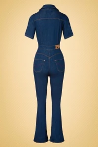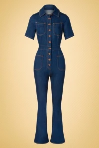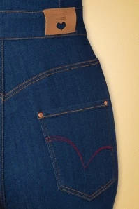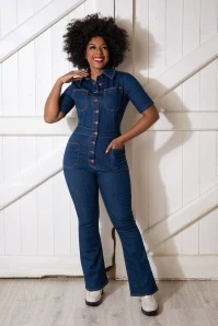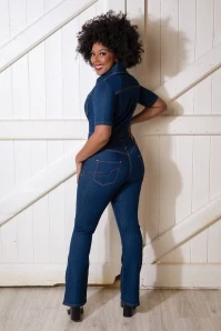 Rock-a-Booty is known for her unique blue dreams… and with this 50s Gloria Lee Jumpsuit in Denim Blue you can make your wildest denim dreams come true! Gloria features a pointy collar, short sleeves, patched breast pockets and a row of copper-toned buttons so you can choose how much of your stunning cleavage you want to reveal. The slim legs are slightly flared at the bottom and will make your legs look endless. She is made of a stunning and firm, dark-blue cotton blend with just a hint of stretch for a curve-hugging fit, finished off with orange-brown and red stitching, a copper-toned zipper and patch pockets front and back for an authentic touch. Gloria, you make my booty look so fine, I got to make you mine!