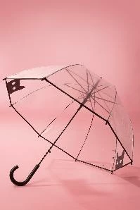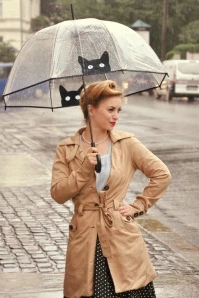 Handy and stylish, this 50s It’s Raining Cats Transparent Dome Umbrella makes it easy to see your way clearly in the rain! This umbrella features a black plastic handle and a transparent canopy made from waterproof PVC that is finished off with a narrow trim and a super cute black cat print. If you see those rain clouds gather, just one push of the button will protect you from the rain. ‘I’m singin’ in the rain!’