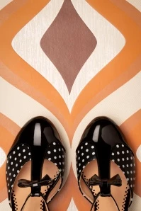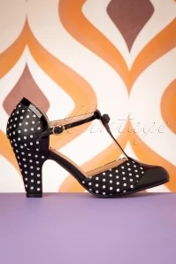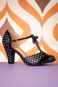 Time to dance the night away with these 50s Kelly Lee T-Strap Pumps in Black on your feet! Made of black faux leather peppered with white polkadots and black faux patent leather. Styled with a T-strap, a round toe, a cute bow and a modest heel. A feast for the eyes and a joy to wear, thanks to the comfy insole! Come on… let’s hit the dancefloor! 😉