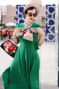 This elegant 50s Layla Cross Over Dress is a true vintage beauty, perfect for any occasion and is exclusively available at TopVintage! Just like the Eric Clapton song; “Layla, you’ve got me on my knees”, wow such a beauty! The fitted bodice features a stunning V-neckline, a beautiful wrap over, two playful fixed tie straps at the left side which can be worn loose or tied and flattering ruches at the side. Made from a smooth and supple, light shiny, stretchy grass green fabric and she has no zipper, making her very easy to put on. Layla, we’re in love!