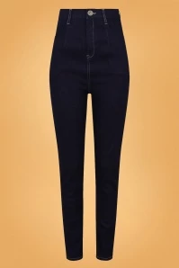Show off your curves in these 50s Lulu Skinny Jeans in Navy! This curve-hugging, high waist denim beauty will accentuate your best features! Made of a stunning, dark-blue cotton blend with a light stretch making her a joy to wear, finished off with copper-coloured buttons and contrast stitching for an authentic touch. Pair Lulu with high heels or sneakers for a feminine but cool look and let your hot curves take centre stage!