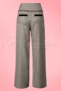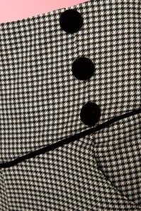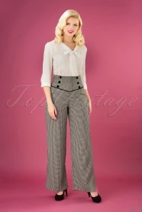 These 50s Swept Off Her Feet Trousers are inspired on the trousers that those progressive women in the 40s / 50s wore! Marilyn Monroe also couldn’t get enough of it 😉 The feminine high waist forms a beautiful contrast with the wide legs and is very flattering. The black velvet faux buttons, faux welt pockets and piping add a playful touch and finish it off perfectly. Made from a supple fabric (doesn’t stretcht!) with an elegant houndstooth pattern. This beauty will sweep you off your feet!