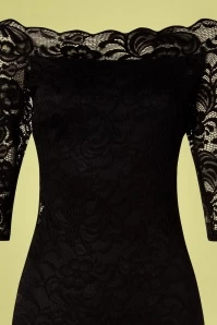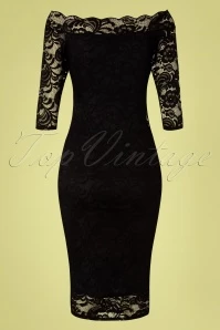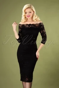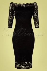 Looking fabulous has never been easier than in this 50s Vera Lace Pencil Dress in Black! From her curve-hugging fit and stunning scalloped boat neck down to the flattering 3/4 sheer lace sleeves, she is the perfect glamorous dress. Made of a supple and stretchy, black fabric layered with black lace for a perfect curve-hugging fit. Feel pretty in lace!