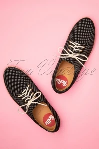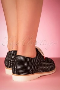 These retro 60s Derby Dream Shoes in Black meet all your requirements, even making you forget about your high heels for a while 😉 Are you a vintage loving lady who likes to soak up some culture during a city trip or a short ‘getaway’? Or do you like strolling up and down the shopping streets for the day? Of course, you still want to look your best no matter what, but do you really want to wear your heels?! These awesome, lightweight, derby lace up shoes are the perfect solution; fun, stylish and so very comfortable! Made of high quality, supple and breathable suede in black, featuring playful little white pin dots and finished with handy laces. The memory foam insole combined with the slightly thicker rubber outsole make these shoes so comfy that you are sure to ‘forget’ your heels more often… you wanna bet? 😉