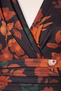 You will want to wear this 70s Liana Floral Jumpsuit in Black and Orange every day! The top features a fixed wrap over, ¾ sleeves and a super flattering, pleated waist band. The flowy, wide legs will make your legs look endless. Orange flowers and green leaves are strewn across a supple and stretchy, black fabric that is a joy to wear. Pair with your favourite accessories to complete the look!