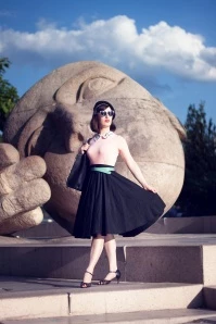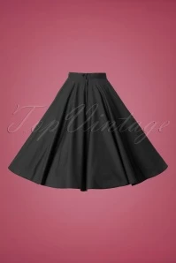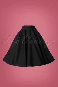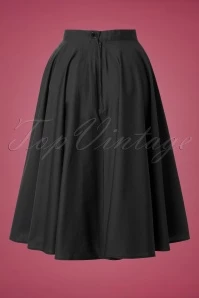 This cheerful 50s Paula Swing Skirt in Black should be part of your vintage clothing collection! The gorgeous, black skirt is worn high at the waist, from where she runs into a happy, breezy swing skirt with handy side pockets. For festive occasions it’s nice to wear with a petticoat underneath. Made of a non-stretchy 100% light cotton with a hidden zipper and cute little button at the back. We think you should have this one!