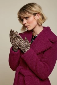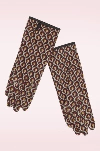 New autumn/winter collection ~ Complete your vintage winter look with these classy gloves. Made of a lovely soft and stretchy acrylic featuring a retro design in red, black, cream and yellow. Black piping and a button at the wrist complete the look.