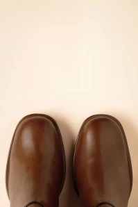 Save these booties… they’re trapped in a box! 😉 Made of high quality cognac-brown leather, finished with dark-brown piping, a block heel and a modest platform.