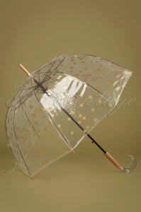 ”Life is not about waiting for the storm to pass, it’s about learning to dance in the rain!” Whether you’re walking or dancing, this fabulous Pois Cuivrés Transparent Dome Umbrella in Gold makes it easy to see your way clearly in the rain thanks to the transparent canopy made from waterproof polyester peppered with gold-toned dots. The umbrella opens with a simple push button, while the transparent plastic handle with a touch of rose gold adds the perfect finishing touch. Let it rain!