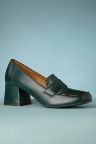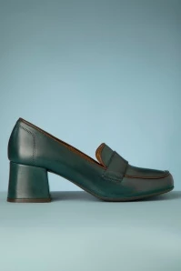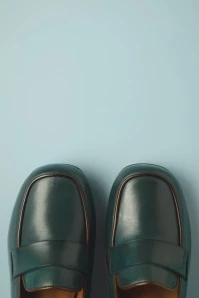 Good shoes take you good places! These classic loafer-inspired, slip-on pumps are made of high quality blue leather, styled with a brown leather trim and a sixties-style block heel.