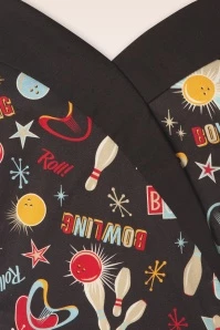 ‘Incredi-bowl!’ This fitted, black dress is made of a breezy, black cotton blend with a light stretch that is a joy to wear and flaunts a bowling print. ‘Spare no-one and get in strike after strike in this jaw-dropper.