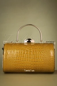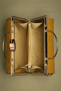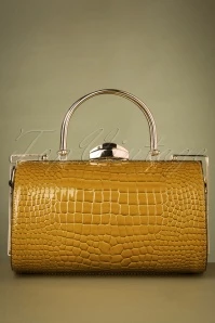 This Box Clutch Bag in Yellow is a real eyecatcher! Made of stunning, mustard-yellow faux crocodile patent leather and finished with a sturdy gold handle and frame. She opens and closes with a clasp fastening that is adorned with sparkling rhinestones. The round shape adds to her unique appearance and gives her that vintage touch. Will you be taking her with you on your next trip? 😉