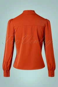 Classy and cute best describe this 50s Tonja Tie Neck Blouse in Rusty Orange! She features long puff sleeves with small buttoned cuffs, a row of buttons down the front and a little stand collar with ruffles and fixed tie straps. Made of a supple, rusty-orange fabric (doesn’t stretch) that is a joy to wear. It’s 10 out of 10 for Tonja.