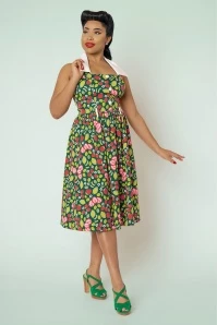 Waverly Strawberry Patch Swing Dress in Green, you are the ‘straw to my berry’!’ This summery dress flaunts a halterneck with an ivory-white contrast collar and a row of faux buttons down the bodice. Made of a supple and breezy, dark-green cotton blend (with a light stretch) featuring a print of juicy strawberries. I love you ‘berry’ much!