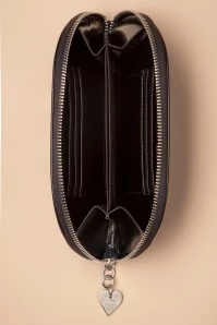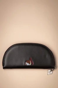 pretty wallet, made of black faux leather, flaunting an embroidered hedgehog surrounded